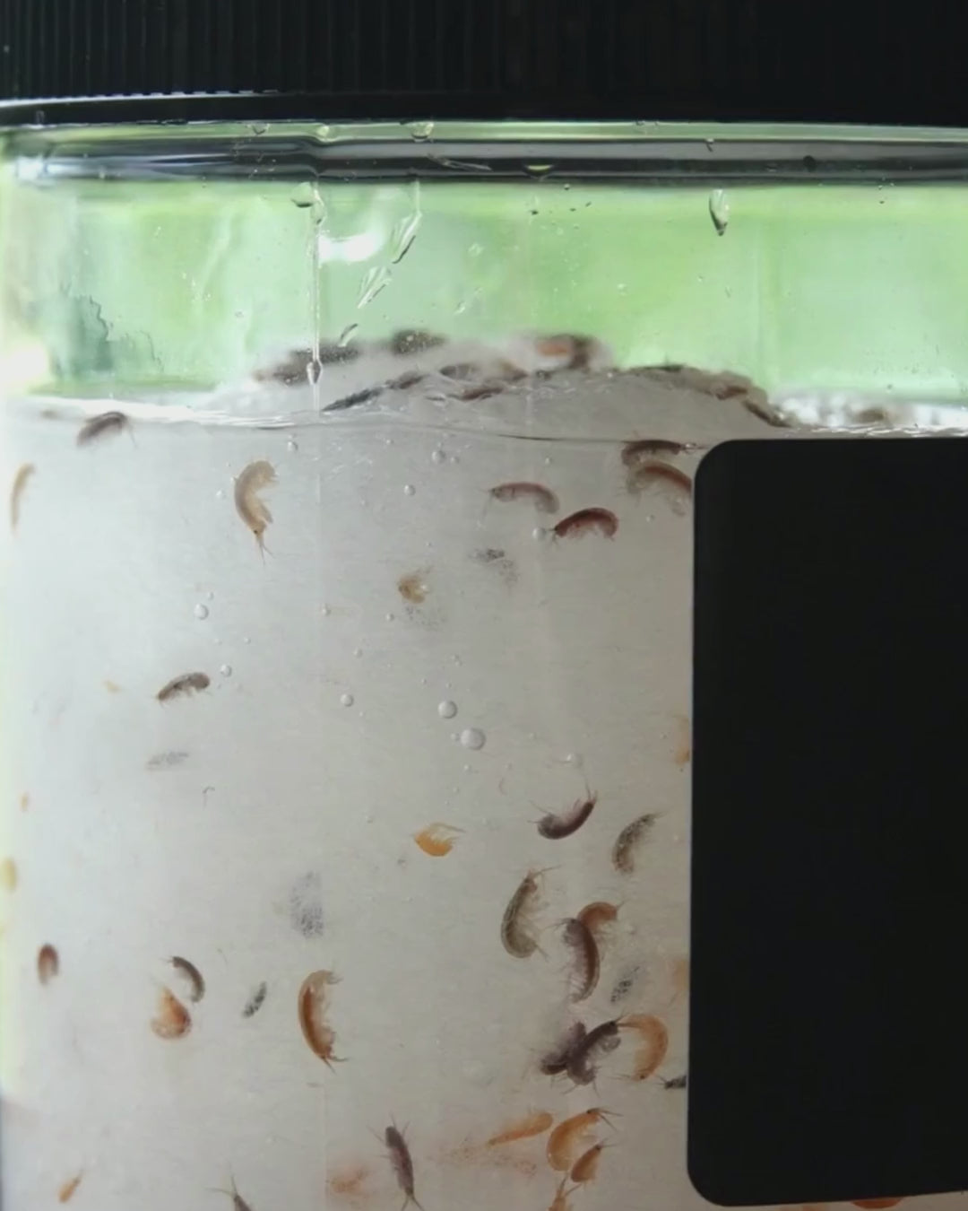 Amphipods are shipped in jars containing a reef-safe nylon sponge (we no longer use the white filter floss you see in the picture - it was too messy). The amphipods are strongly "benthic," meaning the prefer a surface to cling to. They tend to burrow deep inside the sponge due to the stresses of shipping.